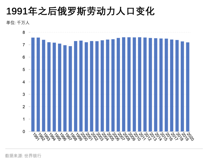 人口总量减少,老龄化进程加快,严重影响俄罗斯的劳动力供给。在俄罗斯每年丧失的人口中,劳动适龄人口占据大多数。1991年之后,俄罗斯劳动力人口不断减少,1998年跌入谷底,只有6886万人,相比1991年减少了近700万人。在这之后虽然有所回升,但随着超过工作年龄的人口比重持续上升,劳动力人口在2011年达到7602万的峰值后,开始呈下降趋势。