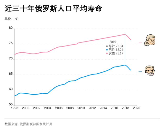 俄罗斯男性和女性的平均寿命相差非常大,近30年来均保持在10岁以上,位列世界第一。俄罗斯男性与中国男性相比,平均寿命整整少十岁。