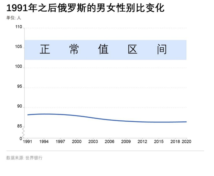 近三十年,俄罗斯男女性别比不断下降。性别比指的是100名女性对应的男性数量。国际上通常将男女性别比在102~107之间视为正常值,而俄罗斯人口性别比在1991年之后一直处于正常值之下,在1994年后持续降低。