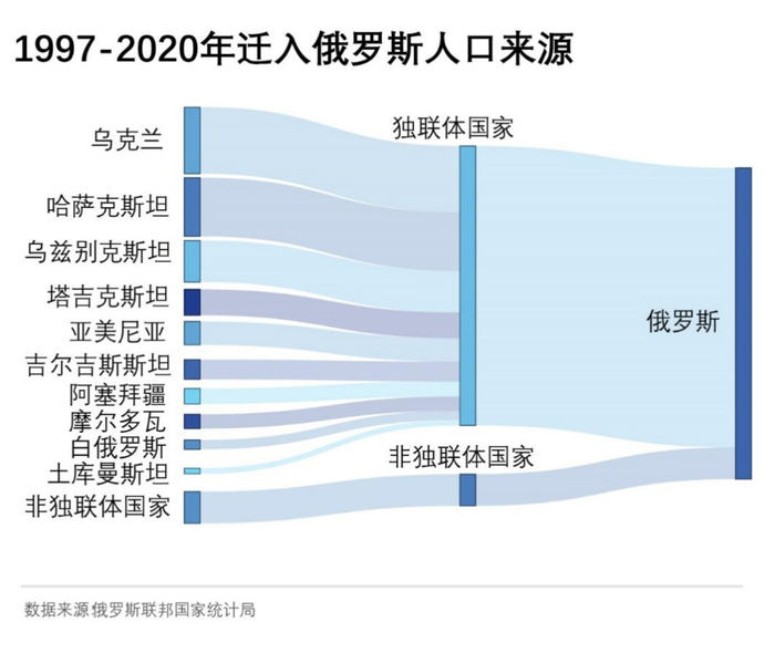俄罗斯移民人口迁入和迁出主要面向独联体国家,这些国家与俄罗斯在政治、地理、历史以及文化上联结密切,德、美、中三国则是非独联体国家中俄罗斯人口移民或被移民的主要国家。