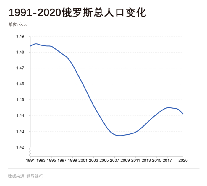 1991年12月26日苏联解体,分裂成15个国家,俄罗斯继承了苏联最大的国土面积,然而政治体制突变给俄罗斯带来重大影响。随着苏联国民经济体系和社会保障体系的瓦解,独立后的俄罗斯出现了社会动荡、经济衰退、住房紧张、就业难等问题。由此导致的女性生育意愿降低,人口外移,令俄罗斯人口一度出现大幅下滑。