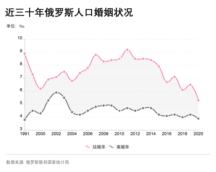 随着俄罗斯社会经济制度的转变和受全球价值观念的影响,以生养孩子、巩固家庭为标准的传统婚姻道德观念逐渐被摈弃。自1995年起,俄罗斯离婚率居高不下,2002年一度接近6‰,近年来虽有所下降,但仍然超过3‰。