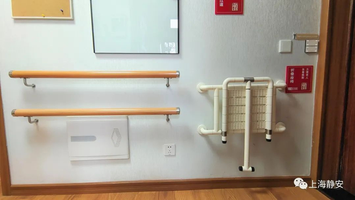 老人在洗澡过程中也会面临更高的意外风险,因此卫生间也安装了扶手和折叠座椅,进行了一系列的适老化改造。