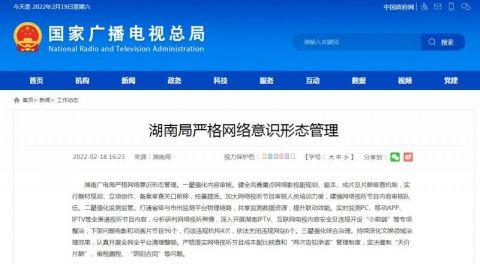 据国家广电总局网站消息,湖南广电局严格网络意识形态管理。