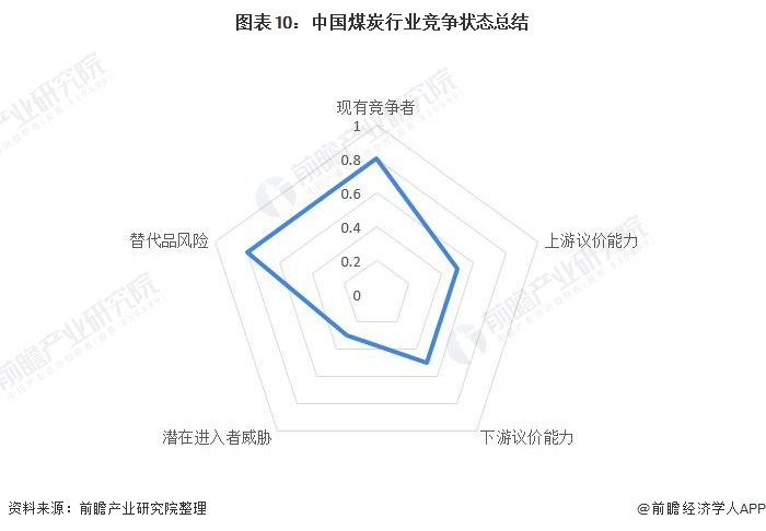 运用波特的“五力”模型,对煤炭行业的竞争环境分析中,可以看到煤炭制造行业竞争较为激烈。根据以上分析,前瞻对煤炭行业各方面的竞争情况进行量化,1代表最大,0代表最小,我国煤炭行业的竞争情况如下图所示。我国煤炭制造行业“五力”中: