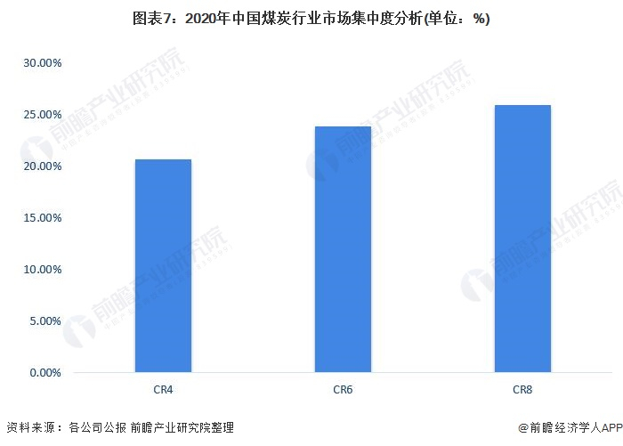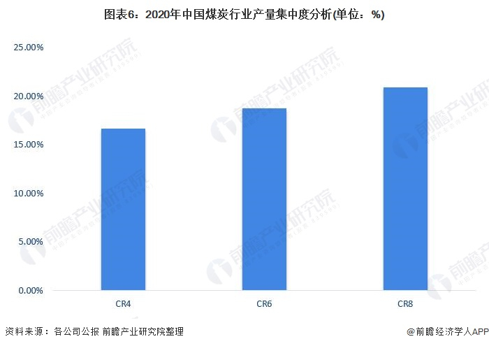 2020年,我国煤炭行业的CR4、CR6、CR8分别为20.66%、23.87%和25.89%。整体来看,国内煤炭企业的市场集中度有待提高。