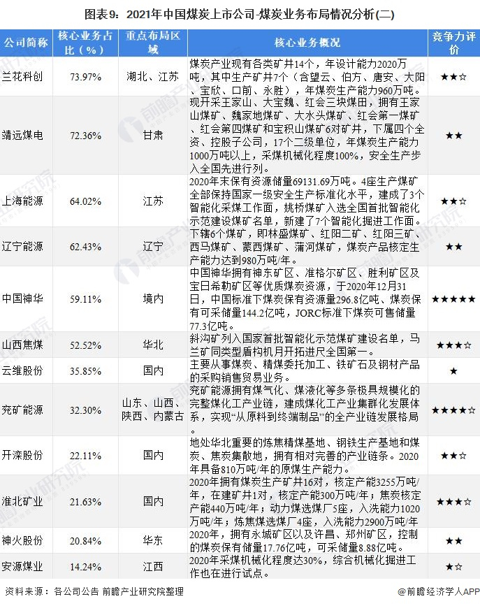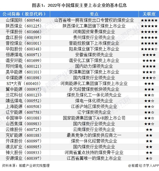 煤炭大量应用于发电、化工、建材以及钢铁行业。我国从事煤炭开采和洗选的企业数量较多,上市企业隶属大型集团的亦不在少数。具体的上市企业汇总如下: