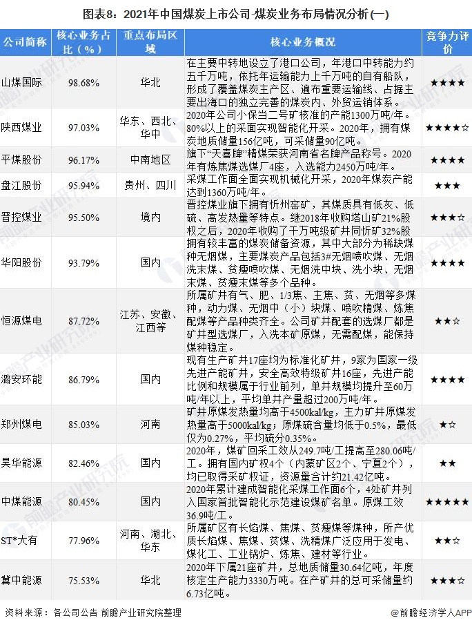 煤炭行业的上市公司中,基本均以国内业务为主。由于煤炭的区域性特征较强,煤炭上市企业的重点布局区域基本围绕煤炭资源邻近地展开。从核心业务占比的情况来看,山煤国际(600546)有98.68%的收入来自煤炭行业,且整体竞争力较强。