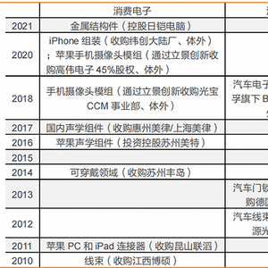 公司“零组件-模组-整机“发展路径清晰,在零组件部分:公司从连接器做起,不断积累客户资源、培养精密化、微型化、一体化能力,随后通过上延产业链+外延 收购成功卡位无线充电、天线、FPC、声学、马达等领域,声光电各板块皆达到行业领先水平;在模组化大趋势下,产品线往模组/整机制造拓展,不断提高模组/整机垂直生产能力,切入 AirPods组装环节带动公司营收高增长,公司各产品线硬件中价值量持续提升。