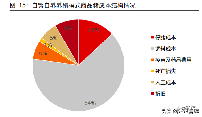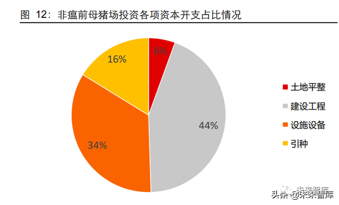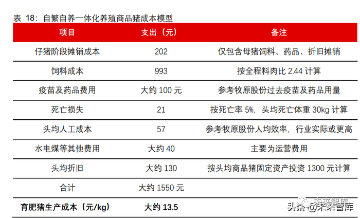 由于所属区域不同以及养殖规模体量不一,或存在些许差异,但整体范围相差不大。对 于规模母猪场,头均仔猪固定资本开支或约 450 元左右,自繁自养一体化养殖场对应头 均商品猪固定资本开支或约 1300 元左右,因此按 10 年折旧计算,规模养殖场头均仔 猪固定资产折旧成本大约 45 元,而头均商品猪固定资产折旧大约 130 元左右。(报告来源:未来智库)