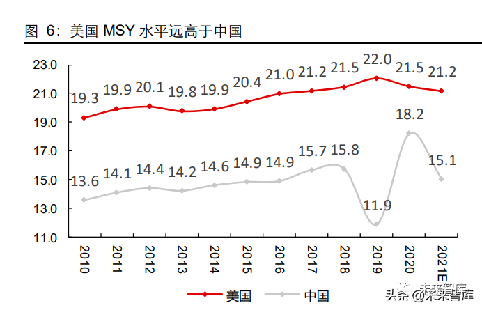 1、育种优势的领先使得美国仔畜生产成本较低。由于美国从 30 年代起即开始在生猪的 育种技术方面开始进行研究,其技术优势较为领先,种群生产性能领先中国。从 MSY (头均母猪年提供商品猪头数)数据情况来看, 2020 年美国 MSY 水平达 21.5 头,高 出中国 3.3 头。2010-2020 年美国平均 MSY 水平高出中国 5.9 头,此外育种的领先也 使得美国养殖料肉比处于较低水平;