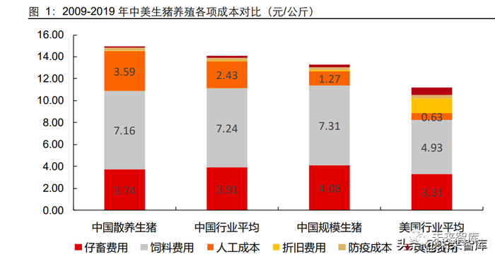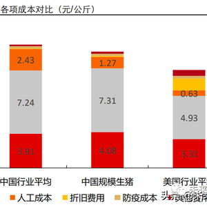1、 仔畜成本的领先。2009-2019 年美国生猪养殖行业生猪成本中平均仔畜成本折算商品猪 约 3.31 元/公斤,领先中国行业平均水平约 0.6 元/公斤;2、饲料成本的领先。2009- 2019 年美国商品猪养殖平均饲料成本约 4.9 元/公斤,领先中国行业平均成本 2.3 元/公 斤;3、人工成本领先。2009-2019 美国商品猪养殖平均人工成本约 0.6 元/公斤,领先 中国行业平均水平 1.8 元/公斤,同中国规模养殖人工成本相比,领先幅度也达 0.6 元/ 公斤。其他方面,美国生猪防疫费用与中国相差不大,均为 0.3 元/公斤左右,折旧费用 和其他费用则高于中国,主要由于猪舍及相关环保设施等投入更高。2009-2019 年美国 生猪平均折旧成本 1.32 元/公斤,高于中国行业平均 1.24 元/公斤。平均其他费用成本 0.73 元/公斤,高于中国行业平均 0.54 元/公斤。