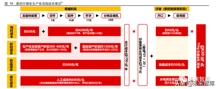 1、 断奶仔猪成本:对于自繁自养一体化企业,仔猪摊销成本仅考虑上文中的母猪饲料 摊销、母猪药品摊销以及母猪折旧成本,合计约 202 元;