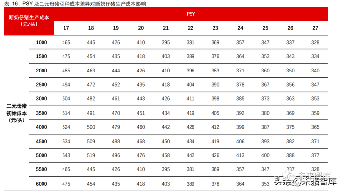 2、 饲料综合价格越高,PSY 的提升对于断奶仔猪成本的下降越明显,在饲料综合价格 为 3.5 元/公斤背景下,PSY 从 17 提升至 18,断奶仔猪成本下降 24 元/头。但 PSY 水平的提升对于断奶仔猪成本影响呈边际递减趋势。当 PSY 从 26 提升至 27 时, 断奶仔猪头均成本下降仅 9 元。