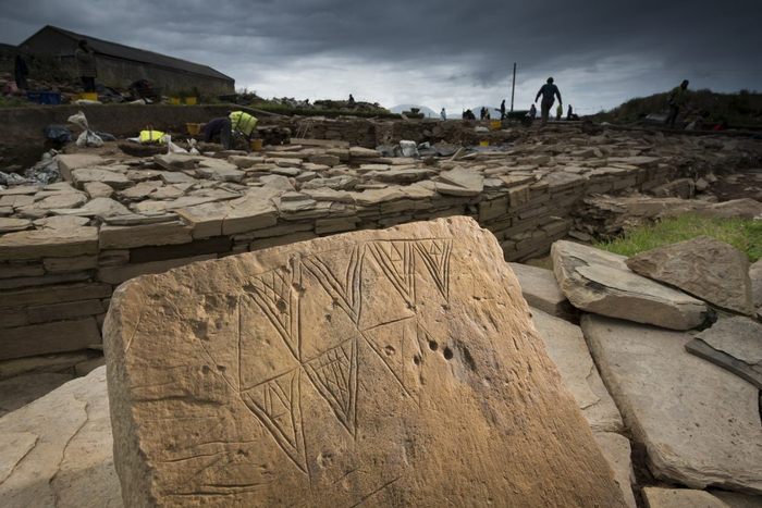 苏格兰北部奥克尼的尼斯布罗德加(Brodgar)新石器时代定居地点出土有装饰的石头。© Jim Richardson