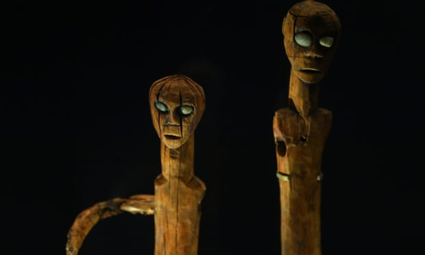 所以当观众置身于展览,需要有足够的耐心解读相似的展品,比如由玉石打造的光滑石斧。还有一些在阿瓦隆沼泽(Avalon Marsh)发现的木桩,这片沼泽位于格拉斯顿伯里(Glastonbury)城外,与亚瑟王传说中的“阿瓦隆”同名。近6000年前,此处排列的古老木桩帮助人们在穿越这片湿地时保持双脚的干燥。在阿瓦隆沼泽中还有一个与巨石阵同时代的粗糙木制神像,展览目录上说,它有“男性和女性特征”。