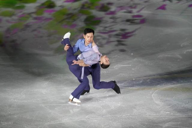 2月20日中午12时,花样滑冰表演滑在首都体育馆精彩上演。中国双人滑组合彭程/金杨第五位上场,他们演绎的曲目是歌手李健的《异乡人》。两人都身着牛仔色裤装,和有水钻点缀的蓝色衬衫式上衣,潇洒而不失优雅。在铺满绿叶紫花的冰面上,两人翩然起舞,给观众带来了一曲极致浪漫的演出。