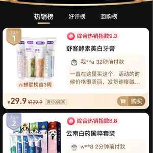 酵素美白牙膏是舒客的明星产品。时代周报记者发现,在舒客天猫官方旗舰店里,一款酵素牙膏售价29.9元,月销量7万多件,在天猫的美白牙膏热销榜、好评榜、回购榜上排行第一,紧跟其后的是云南白药的国粹套装。