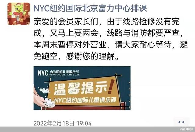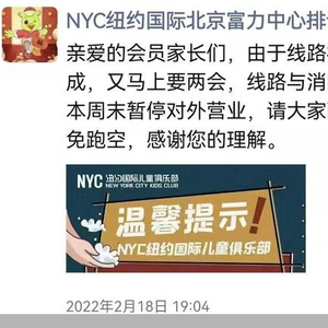 天眼查显示,NYC纽约国际儿童俱乐部隶属于纽克乐博教育科技(北京)有限公司,面向为0-7岁儿童及家庭提供早期教育课程和早期教育服务。截至2月20日,该机构公众号上显示,北京仍有13家门店在营,其中就包括了闭店的双井和天通苑门店。