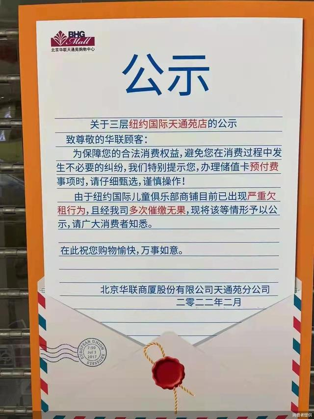 预付卡的坑,总是躲不掉。2月20日,北京商报记者接到消费者投诉,位于天通苑华联BHGMall和双井富力广场的NYU纽约国际儿童俱乐部(以下简称“纽约国际早教”)突然闭店,均以商场消防检查为由暂停所有课程。记者在调查过程中向相关商场了解到,上述门店已经拖欠租金或物业费数月,目前均联系不到相关负责人。