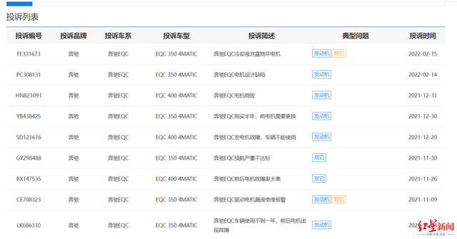 像王冲这样的情况不在少数。红星资本局注意到,在中国网汽车投诉平台上,2021年共有27条关于奔驰EQC的投诉,其中有24条都涉及电机故障;在车质网上,2021年共有20条奔驰EQC的投诉,其中有19条都涉及电机故障。