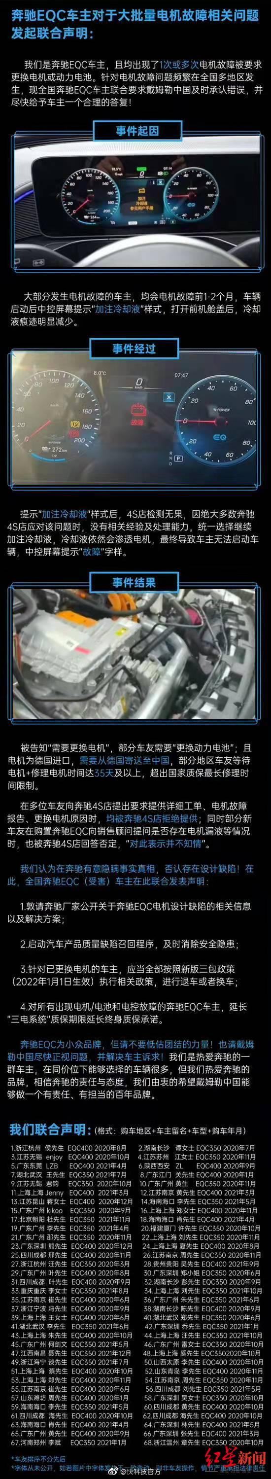 随后,68位奔驰EQC车主们联合起来,发布一封关于大批量电机故障相关问题的联合声明。