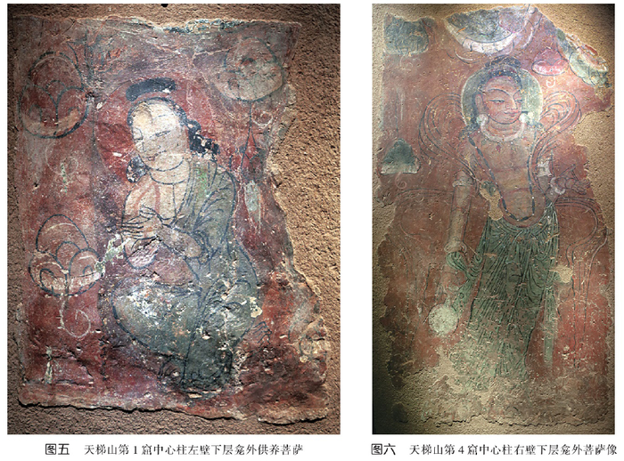 菩萨与飞天均为菩萨装,头束蘑菇状发髻,长发披肩,面相浑圆,身体硕壮,身着袒右式大衣,下身着裙,右腰处打一小结,裙摆紧裹下身,露双足。菩萨身姿明显扭动,双手合十,双足叉开,作礼拜状。飞天身姿呈U形,手势各不相同,双足分开。其样式与炳灵寺第169窟西秦壁画中的菩萨(图二)或菩萨装飞天十分相似,如蘑菇状的发髻,披肩的长发,袒右式大衣,这种样式也见于武威天梯山第1窟北凉供养菩萨像(图五)。天梯山第4窟北凉菩萨立像,除了上身袒露,佩戴璎珞以外,其发式也相同(图六)。可见,这种菩萨样式是西部地区十六国时期流行的样式。