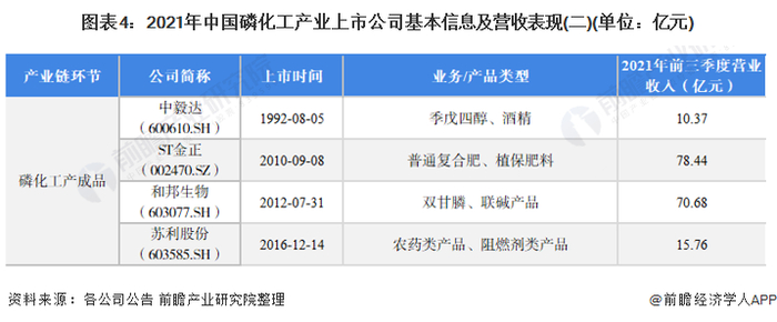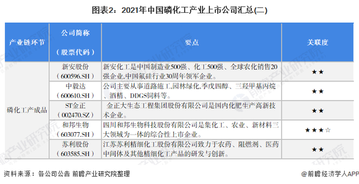 磷化工产成品上市公司:晨化股份(300610.SZ)、六国化工(600470.SH)、新洋丰(000902.SZ)、新安股份(600596.SH)、中毅达(600610.SH)、ST金正(002470.SZ)、和邦生物(603077.SH)、苏利股份(603585.SH)。