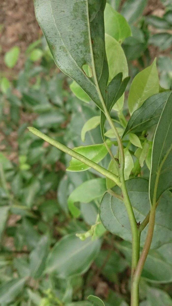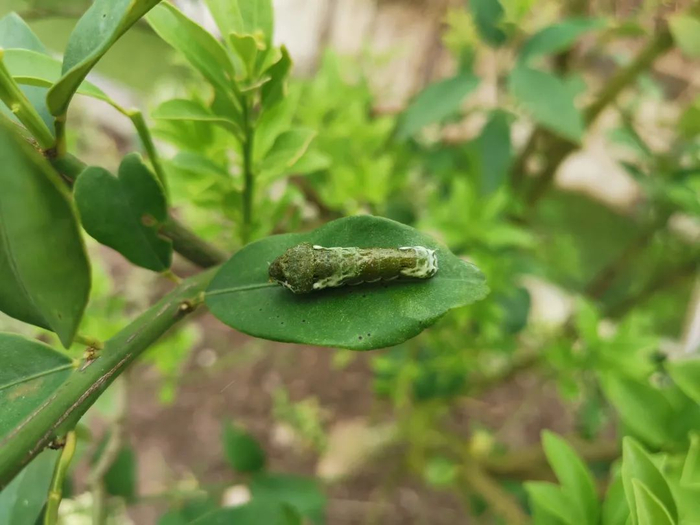 樟翠尺蛾,幼虫黄绿色,静止时,多在叶子尖端或叶缘处用臀足攀住叶子,身体向外直立伸出,形如小枝。