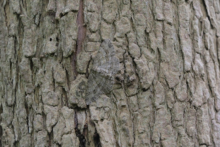 石榴巾夜蛾,幼虫与树皮相似,白天静伏于枝条上,不易发现。