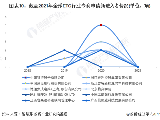 全球十大新进入者分别是中国银行股份有限公司、浙江吉利控股集团有限公司、中国建设银行股份有限公司、浙江吉智新能源汽车科技有限公司、博通集成电路(上海)股份有限公司、北京物资学院、DAI NIPPON PRINTING CO LTD、中国工商银行股份有限公司、江西省高速公路联网管理中心和广西信路威科技发展有限公司。其中,中国银行股份有限公司在2020年申请ETC专利数量较多,为5项。