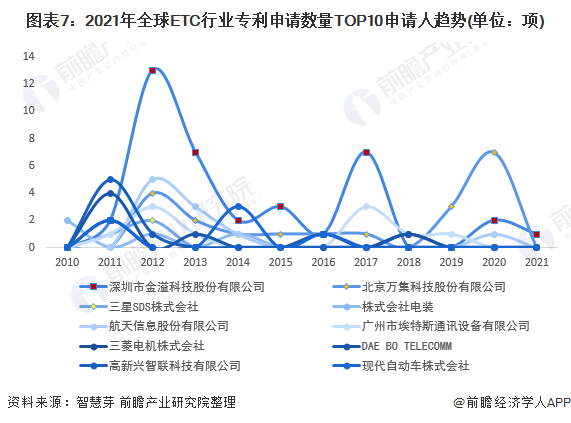 趋势方面,深圳市金溢科技股份有限公司申请的ETC专利数遥遥领先,2021年,深圳市金溢科技股份有限公司ETC专利申请量为1项。