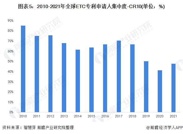 2010-2021年10月,全球ETC专利申请人CR10呈现下降趋势,由2010年的85%下降至2021年的47.62%。整体来看,全球ETC专利申请人集中度呈现下降趋势。