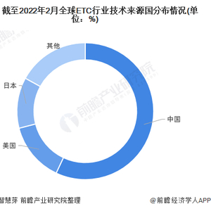 目前,全球ETC第一大技术来源国为中国,中国ETC专利申请量占全球ETC专利总申请量的57%;其次是美国,ETC专利申请量占全球ETC专利总申请量的14%。日本排名第三,占全球ETC专利总申请量的12%。