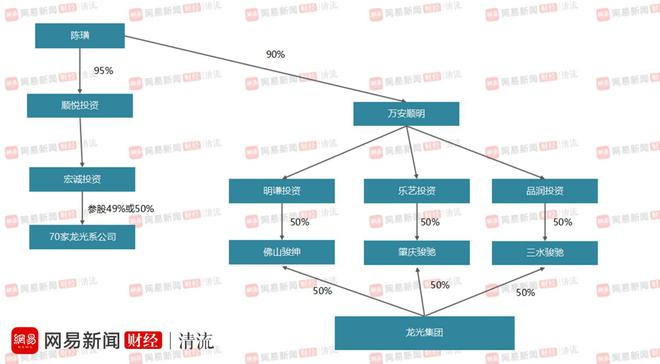 陈璜还控制另一家投资公司,万安顺明企业管理服务中心(有限合伙)(下称“万安顺明”),该公司由陈璜和高雅君分别持股90%和10%。万安顺明下设三家投资公司――深圳市明谦投资有限公司、深圳市乐艺投资有限公司及深圳市品润投资有限公司(下称“品润投资”)。这三家投资公司均分别与龙光集团合资设立项目公司,并持有项目公司50%股权。