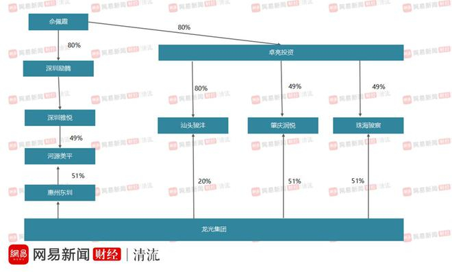 佘佩霞和林振海二人,还设有合资公司深圳市卓亮投资有限公司(下称“卓亮投资”)。通过层层持股,该公司入股汕头市龙光骏沣房地产有限公司(下称“汕头骏沣”)并持有80%股权,另外20%股权由龙光集团持股,因此其资产及债务不并入合并报表,这或许形成龙光集团部分表外负债。