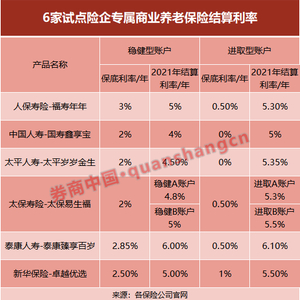 专属商业养老保险产品的收益为“保证+浮动”模式,从2021年情况看,实际结算利率要远高于其设定的最低保证利率。目前6家公司的产品,对稳健型账户的最低保证利率在2%-3%之间,进取型账户的最低保证利率在0-1%之间。