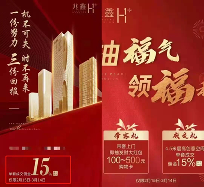 日前,位于深圳罗湖的兆鑫汇金广场项目发出一张转介营销海报——单套成交佣金高达15%,中介只要带客上门即可抽取100元-500元的购物卡红包。不仅如此,海报上还写着“一份努力,三份回报”的字样,满屏透露着“先到先得”的气息。