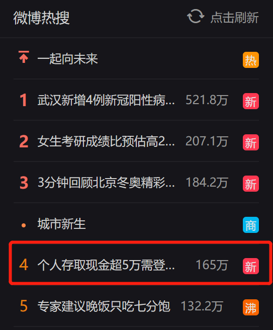 这一消息一度登上微博热搜,随后,人民银行有关司局负责人对《金融机构客户尽职调查和客户身份资料及交易记录保存管理办法》第十条关于个人现金存取规定进行了解读。