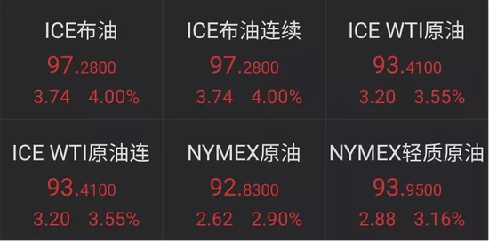 股市受挫的同时,国际油价集体走高,布油、WTI原油均上涨3%以上,尾盘布伦特原油期货一度破97美元/桶,创下近七年历史新高,NYMEX原油上涨2.9%。