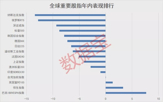 2022年开年以来,全球重要股指均呈下跌态势。证券时报·数据宝统计,年初至今重要股指平均下跌4.55%,其中俄罗斯RTS、纳斯达克指数均下跌10%以上,德国DAX、韩国综合指数、标普500等7个市场股指下跌5%以上;去年跌幅最大的恒生指数今年以来表现较好,上涨3.3%排行第二。