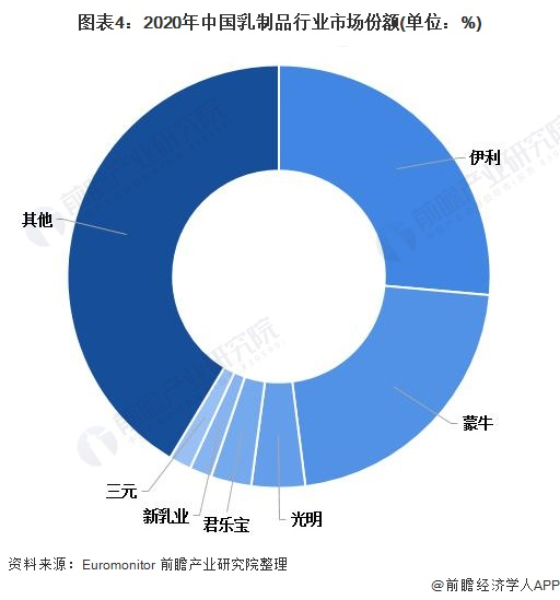 根据Euromonitor,2020年伊利和蒙牛两大巨头市场份额占比分别为26.4%和21.6%;光明、君乐宝、新乳业、三元市场份额分别为4.1%、3.1%、1.7%和1.7%。