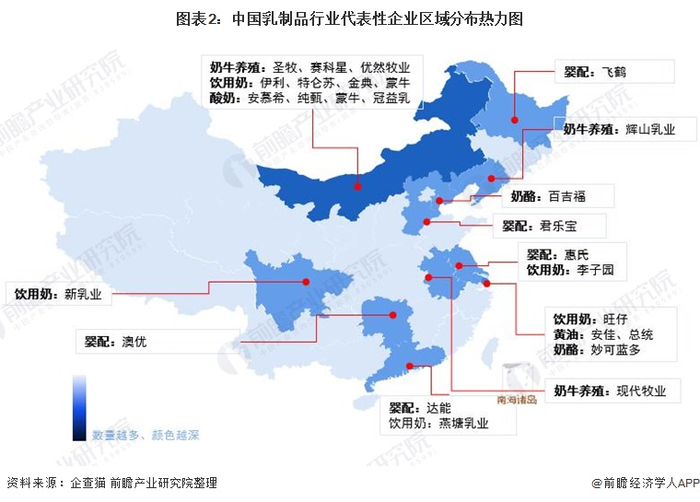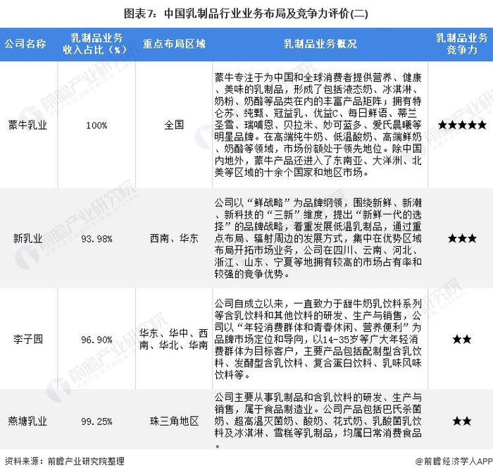 全国性乳业企业产品结构丰富、品牌影响力强、渠道铺设完善,具备显著规模优势,领先地位稳固;区域性乳企在重点经营的区域内具备较高的市占率、品牌知名度、消费者忠诚度及较完善的渠道网络;地方性乳企规模较小,经营区域仅为部分省内及周边地区,在经营区域内具备一定知名度。地方性乳企牧场靠近主要消费区域,主要通过生产销售低温乳制品进行差异化发展。