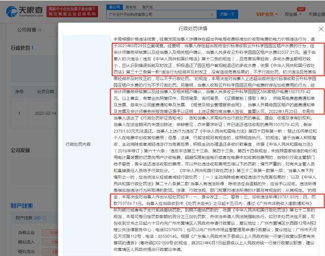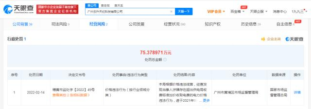 天眼查APP显示,近日,广州云升天纪科技有限公司新增一则行政处罚,处罚事由为当事人共多收云升科学园园区租户水费8万余元、电费150万余元,鉴于多收水费金额相对较小,不予行政处罚;对多收电费的行为没收违法所得2万余元并罚款75万余元,处罚单位为广州市黄埔区市场监督管理局。