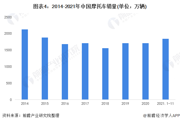 从我国摩托车销售数量来看,我国摩托车销量从2014年以来进入滑坡通道,至2018年,行业销售数据达到了近年来的低点,为1557.05万辆。随后开始回暖,2020年受疫情影响,也仅是较2019年小幅下降,2021年1-11月,我国摩托车销量已达到1844.45万辆,已超过2020年全年的数据。