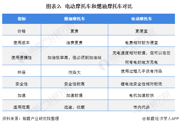 对比电动摩托车和燃油摩托车的性能、价格和安全性等指标来看,电动摩托车价格更便宜、使用成本也更低且在使用过程中几乎没有污染,因此作为市内代步用途,更具发展优势。