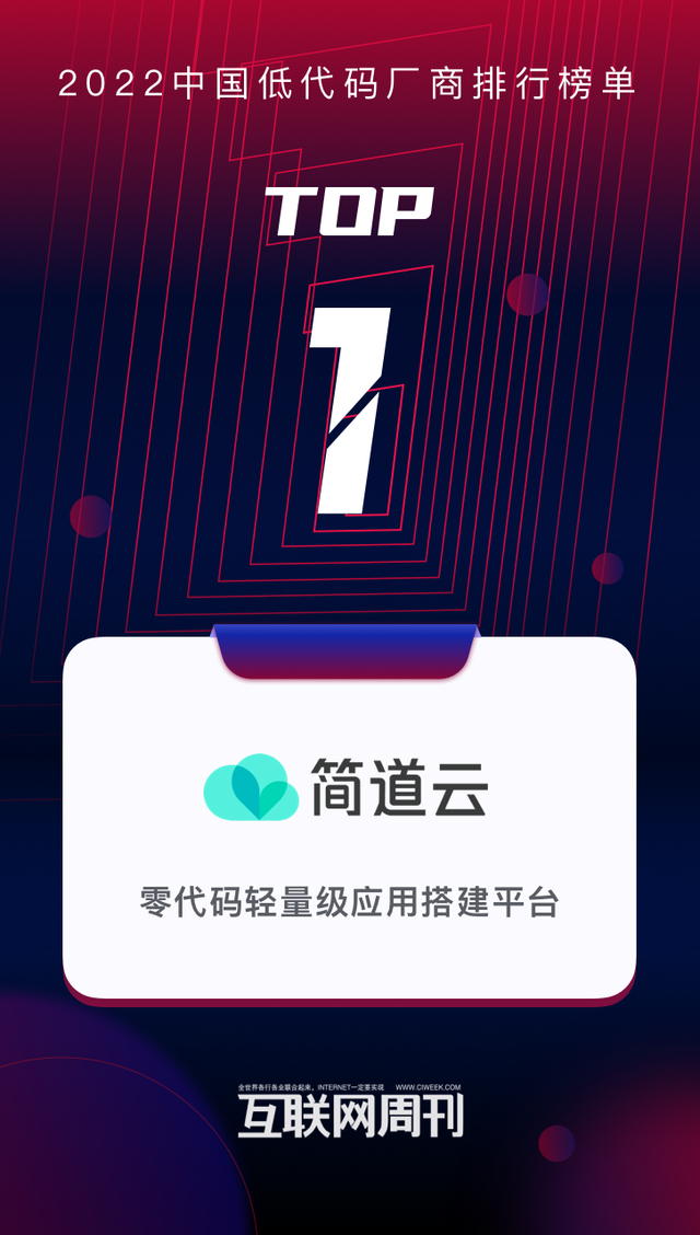 简道云荣登互联网周刊「2022国内低代码厂商排行榜」第一!