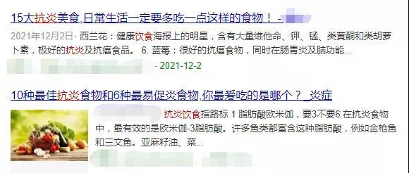 而具有改善慢性炎症的食物成分,包括ω-3型脂肪酸、多酚、膳食纤维以及天然抗氧化剂;这些物质可通过阻断信号、抑制前列腺环氧化酶表达、调低炎症介质水平以及激活抗炎途径等方式发挥抗炎效应,也可通过调整肠道菌群,产生短链脂肪酸等方式间接产生抗炎效果。