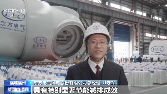 福建福州东方电气风电股份有限公司总经理 尹守军:13兆瓦风电机组的成功投用,具有特别显著节能减排成效,其成功下线,对于提升产业链的升级,提高我们国产装备的进步,带动国产(设备)的吊装,海工等设备的制造、升级,具有积极牵引作用。