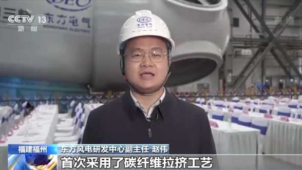 福建福州东方风电研发中心副主任 赵伟:我们研制的与这次下线机组配套的叶片,首次采用了碳纤维拉挤工艺,突破了百米级超长柔性叶片研制的系列难题,单支叶片长度103米,刷新了我国风电叶片最长纪录。